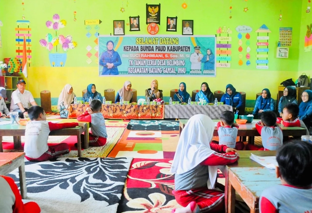 Kunjungan dimulai dengan kegiatan edukatif di TK Ceria Desa Belimbing. Bunda Suci—sapaan akrab Ketua TP PKK sekaligus Bunda PAUD Inhu—menyapa peserta didik, membagikan buku gambar, serta mengajak para guru untuk menciptakan suasana belajar yang ceria dan menyenangkan.